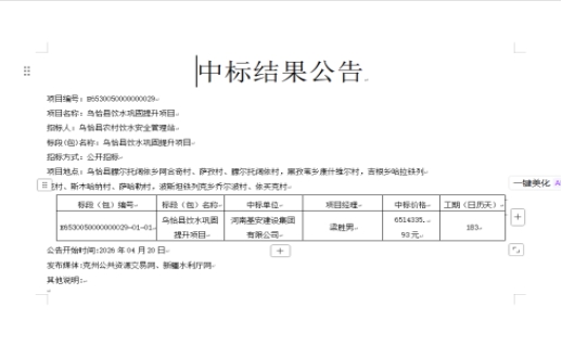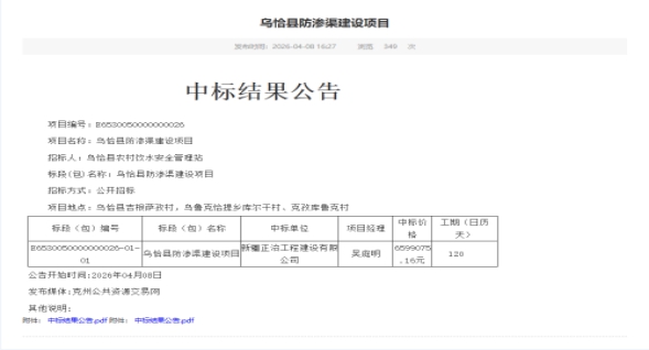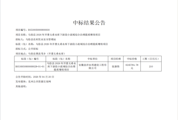 乌恰县水利局2026年项目招标结果公示
