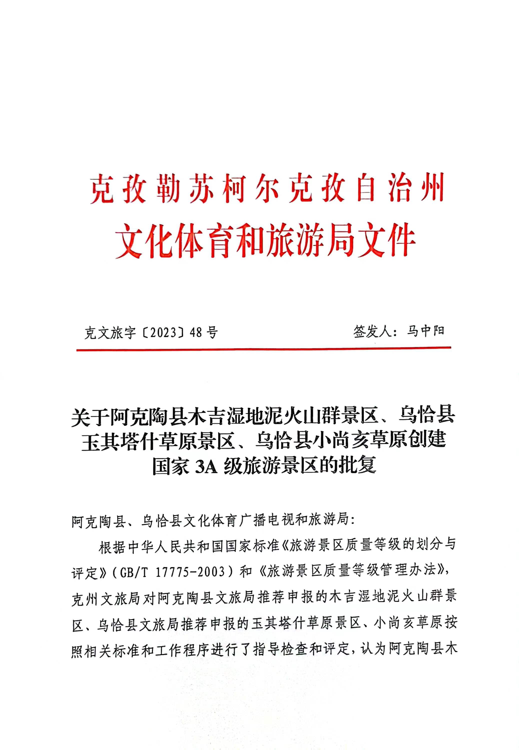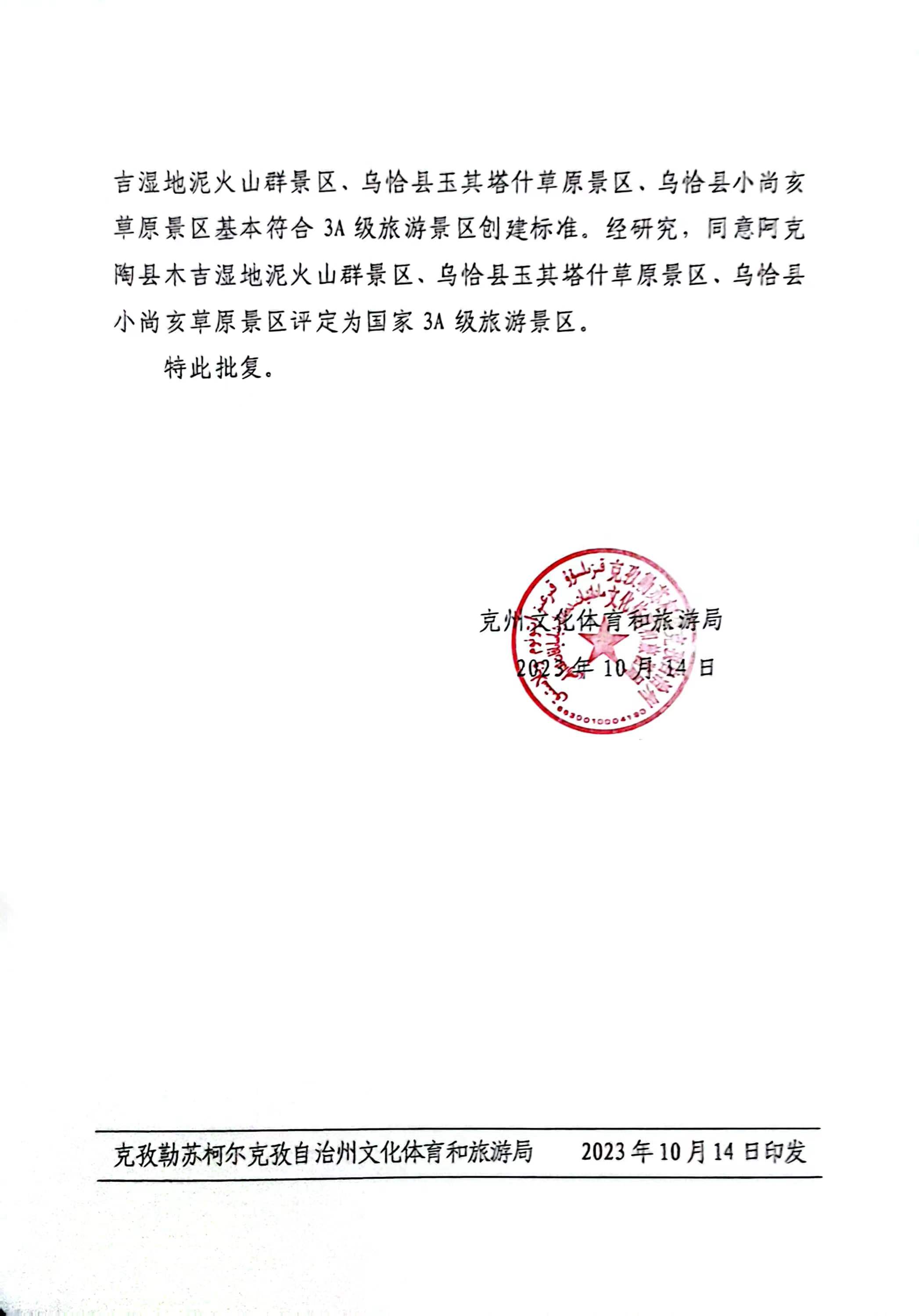 关于阿克陶县木吉湿地泥火山群景区、乌恰县玉其塔什草原景区、乌恰县小尚亥草原创建国家3A级旅游景区的批复