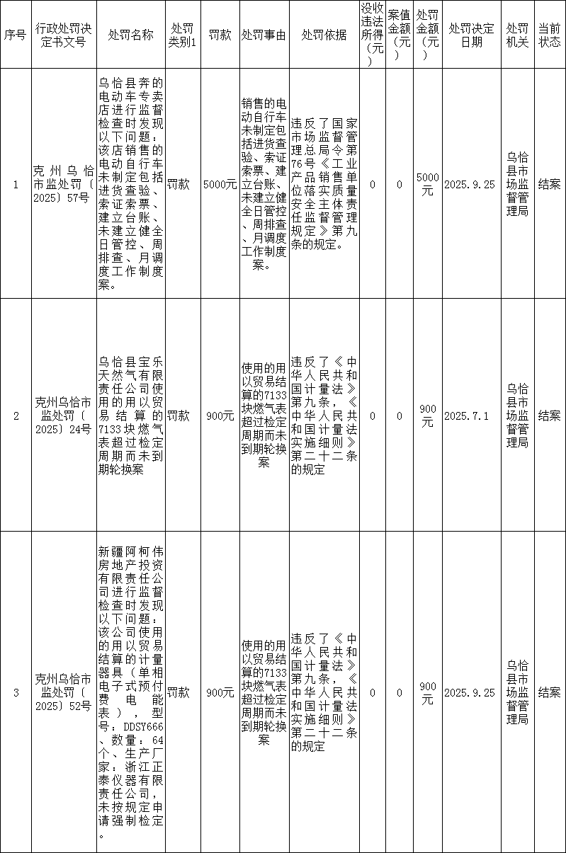 2025年乌恰县市场监督管理局行政处罚案件(9月)