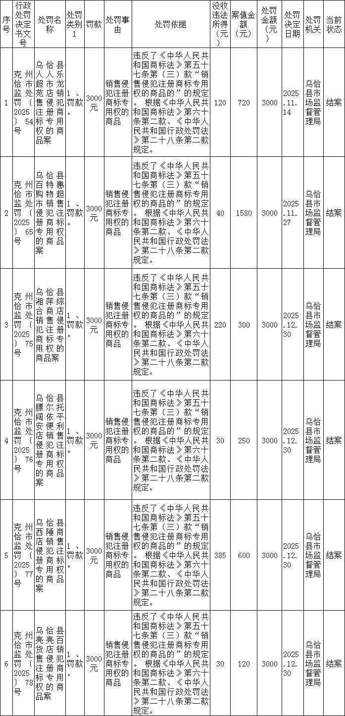2025年乌恰县市场监督管理局行政处罚案件(12月)