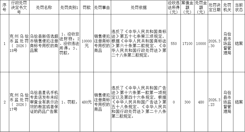 2026年乌恰县市场监督管理局行政处罚案件(4月)