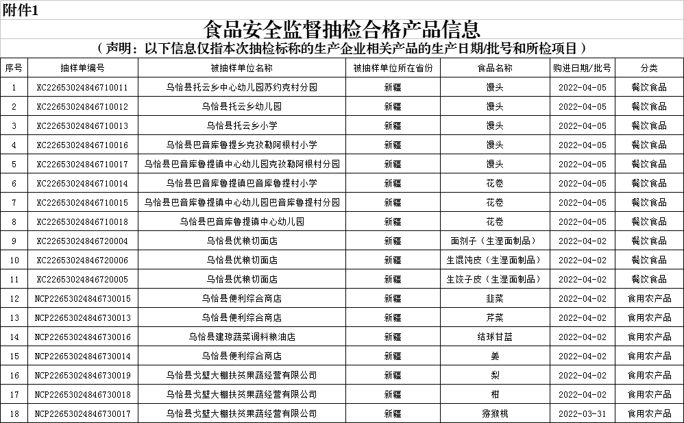 根据《中华人民共和国食品安全法》和《食品安全抽样检验管理办法》的规定,近期乌恰县市场监督管理局对辖区范围内生产经营的餐饮食品、食用农产品2大类共18批次进行了监督抽检,抽样检验合格样品18批次,不合格样品0批次。