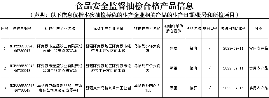 根据《中华人民共和国食品安全法》和《食品安全抽样检验管理办法》的规定,近期乌恰县市场监督管理局对辖区范围内生产经营的食用农产品1大类共3批次进行了监督抽检,抽样检验合格样品3批次,不合格样品0批次。