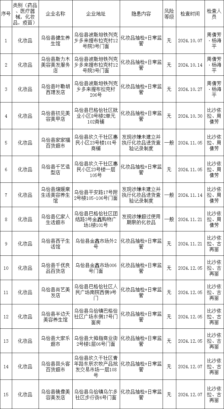 乌恰县市场监督管理局2024年化妆品质量安全风险排查清单(第四季第)