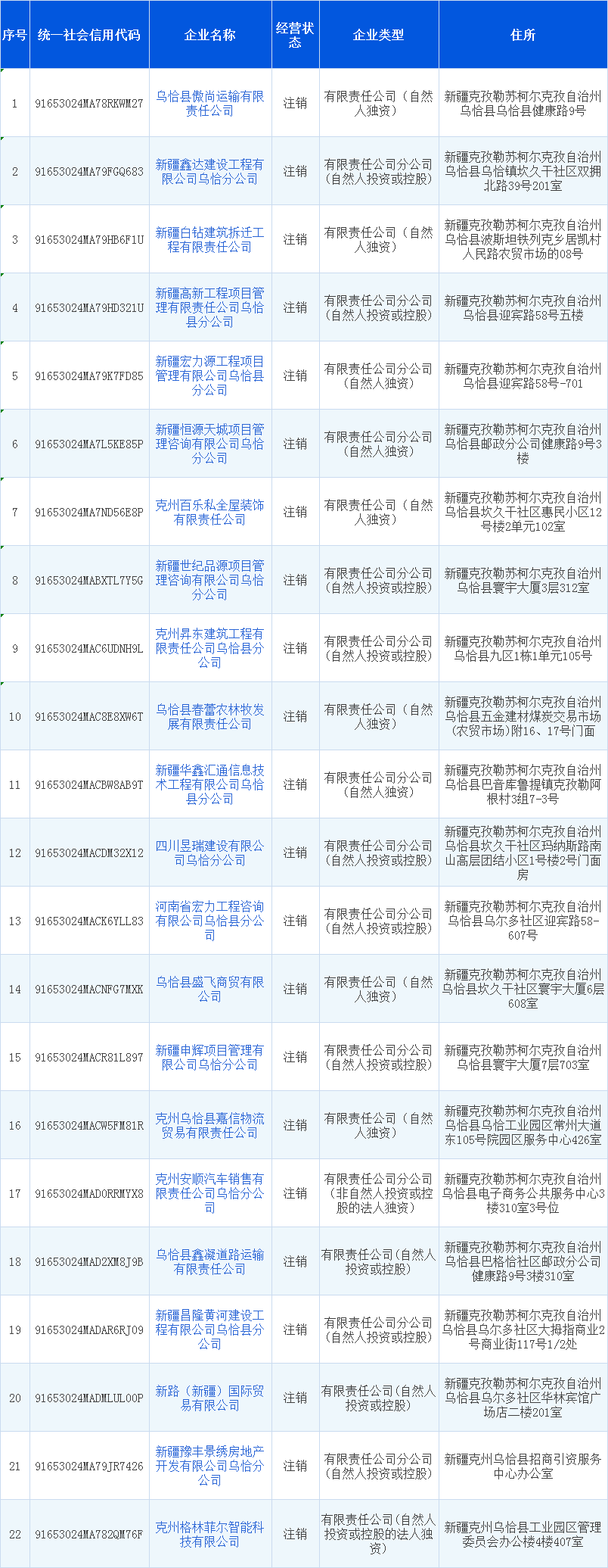 乌恰县市场监督管理局2024年第四季度企业注销名单