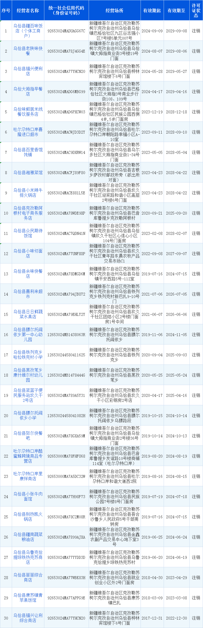 乌恰县市场监督管理局2024年第四季度注销食品经营企业名单