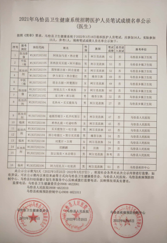 2021年乌恰县卫生健康系统招聘医护人员笔试成绩名单公示(医生)