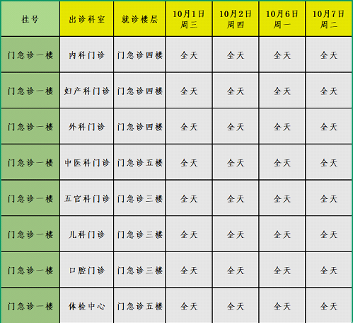 根据《国务院办公厅关于2025年部分节假日安排的通知》相关要求,2025年国庆节与中秋节假期相连,10月1日至10月8日放假调休,共8天。为保障假期前后工作有序衔接,特作如下调休安排:9月28日(星期日)、10月1日(星期三)、10月2日(星期四)、10月6日(星期一)、10月7日(星期二)正常开诊。具体出诊科室详见安排表。