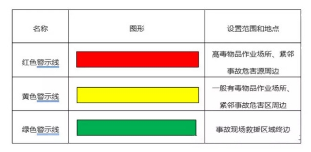 设在固定场所的警示线宽度为10cm,警示线可用涂料制作。临时警示线宽度为10cm,可用纤维等材料制作。
