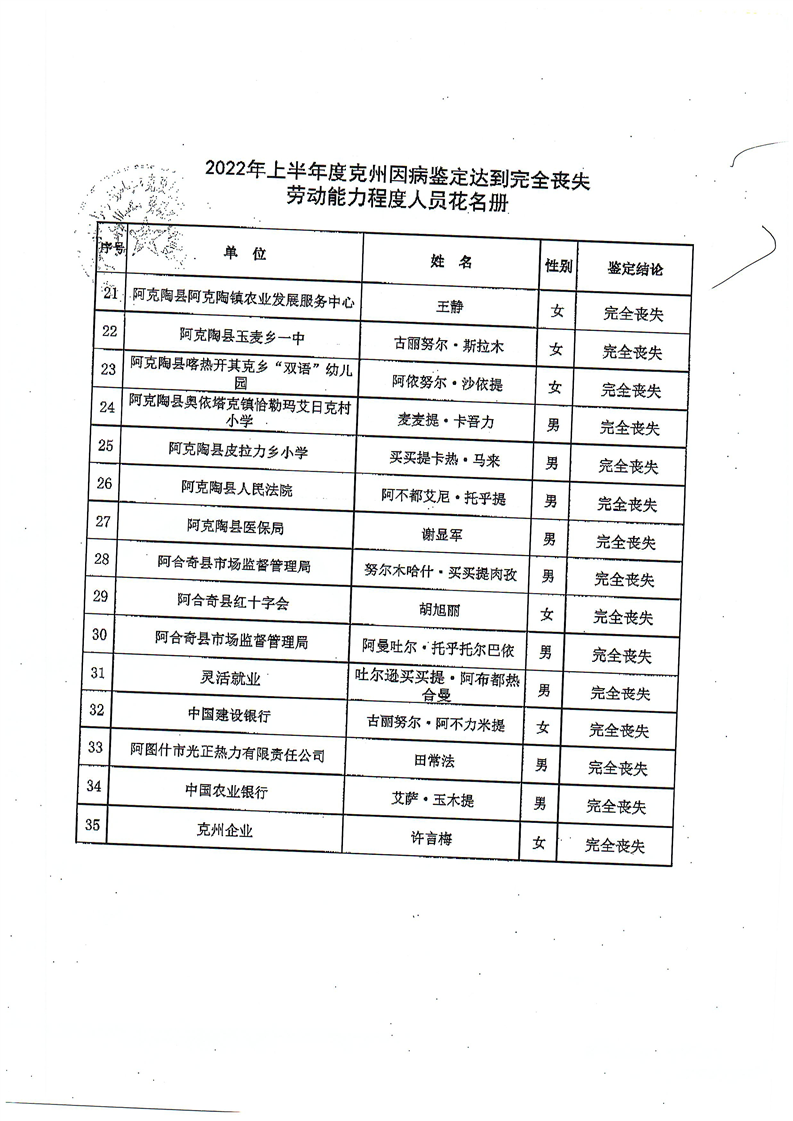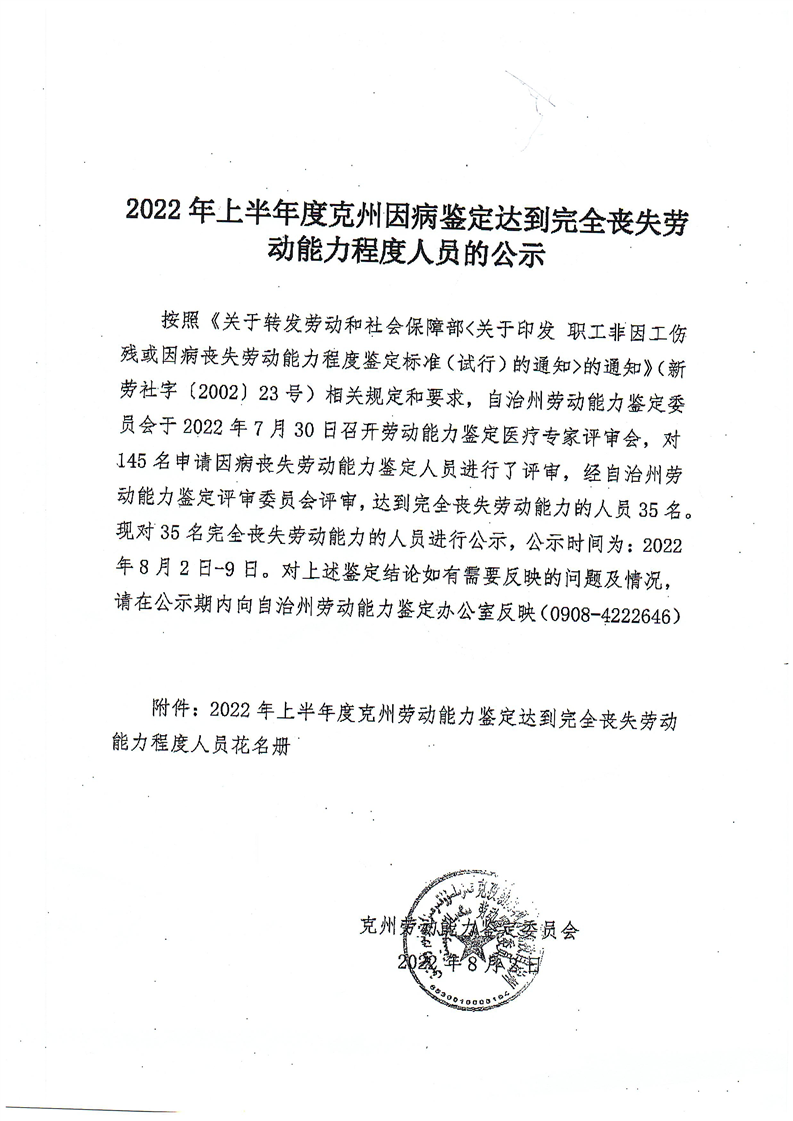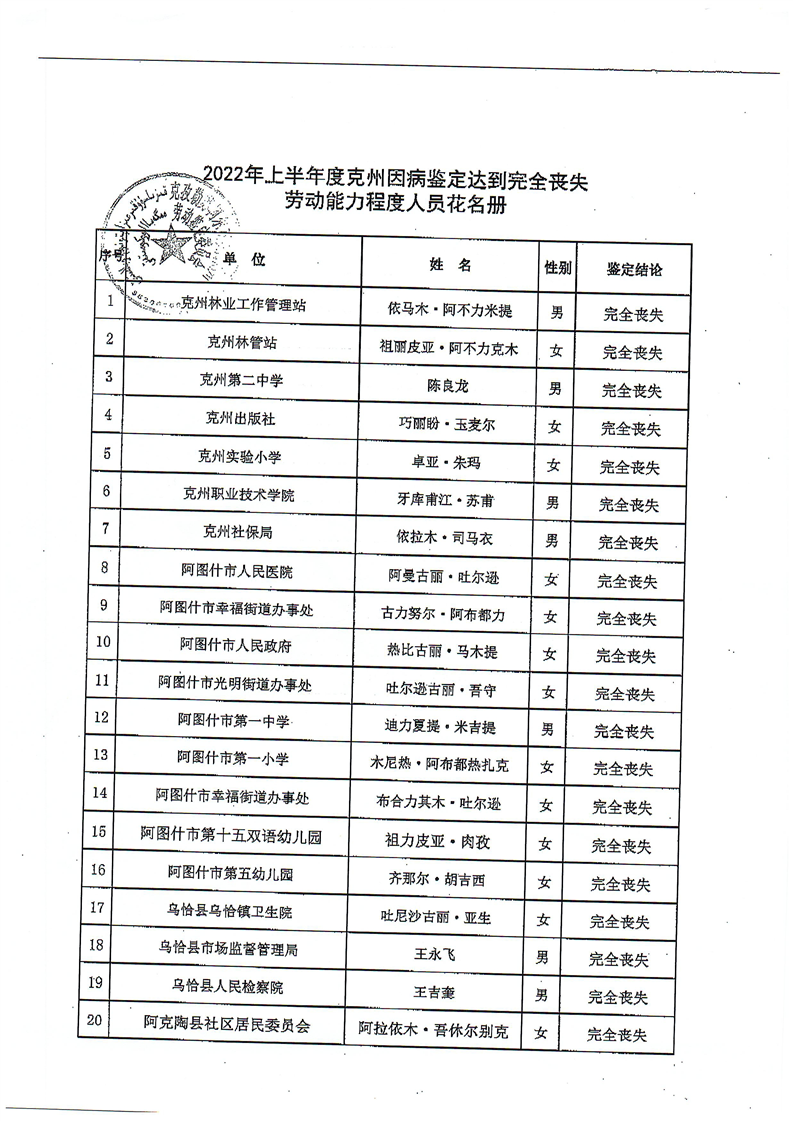 2022年上半年度克州因病鉴定达到完全丧失劳动能力程度人员的公示