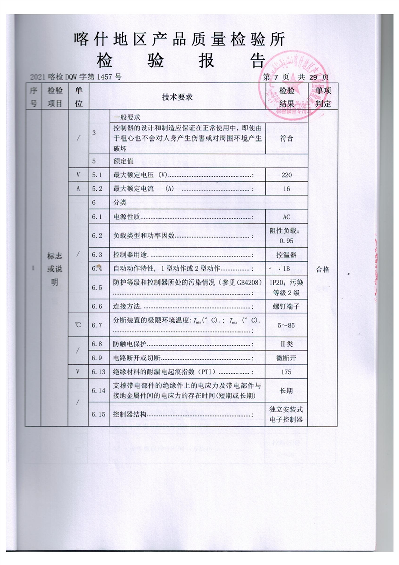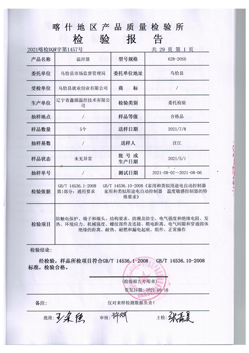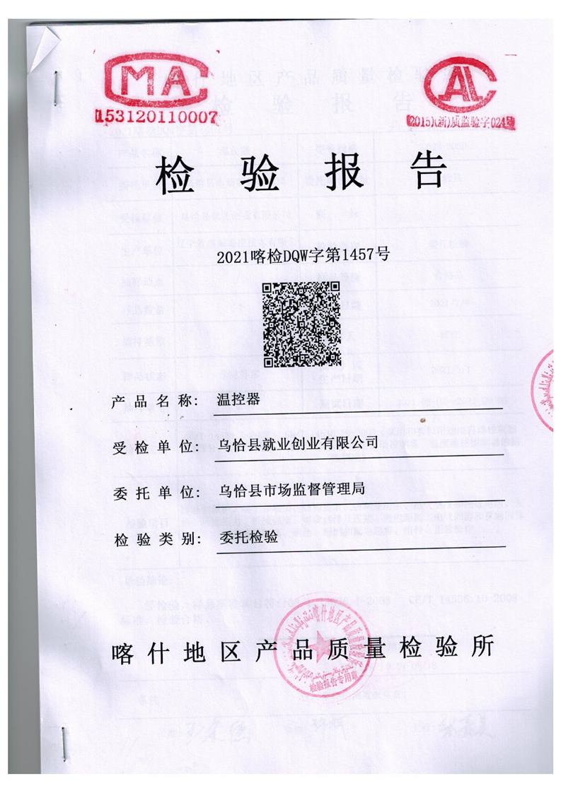 乌恰县市场监督管理局“煤改电”项目温控器检验报告