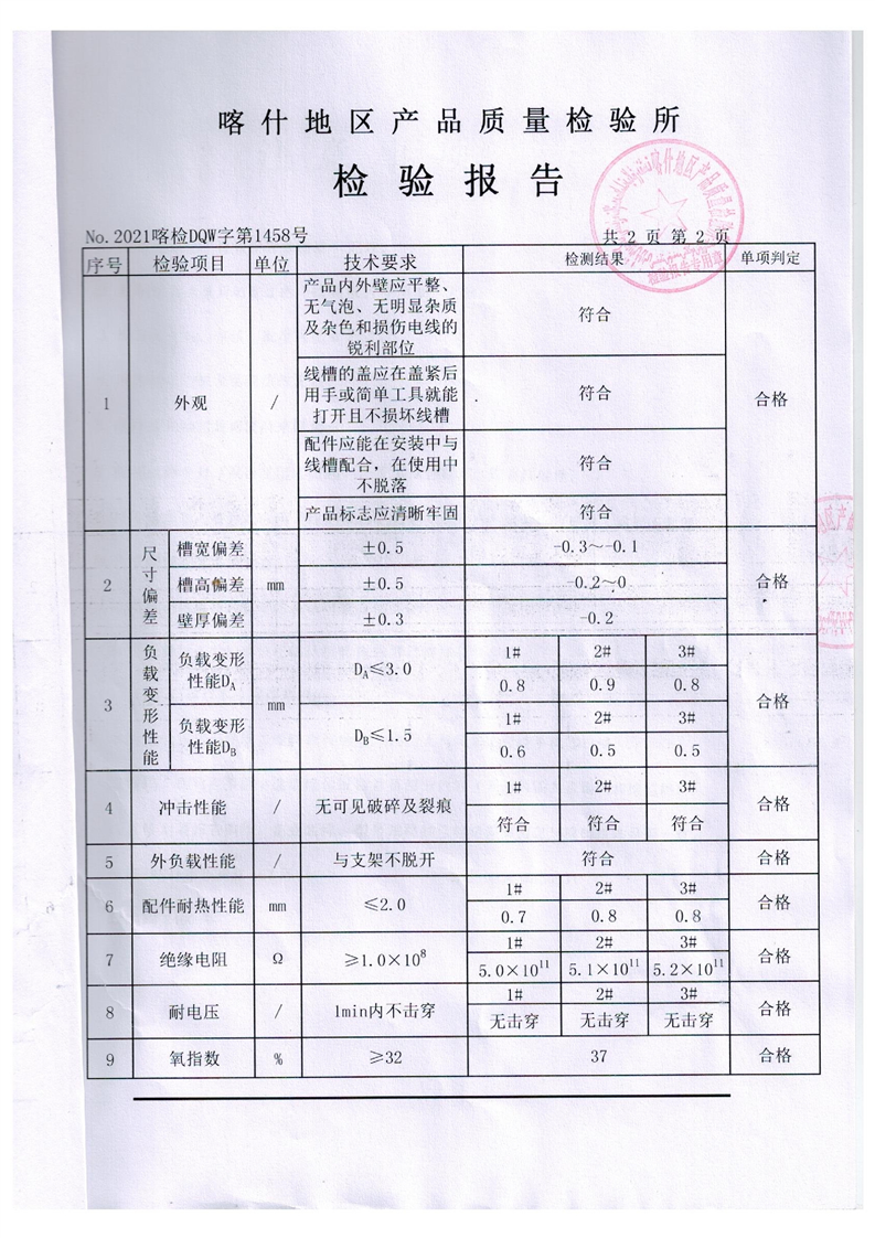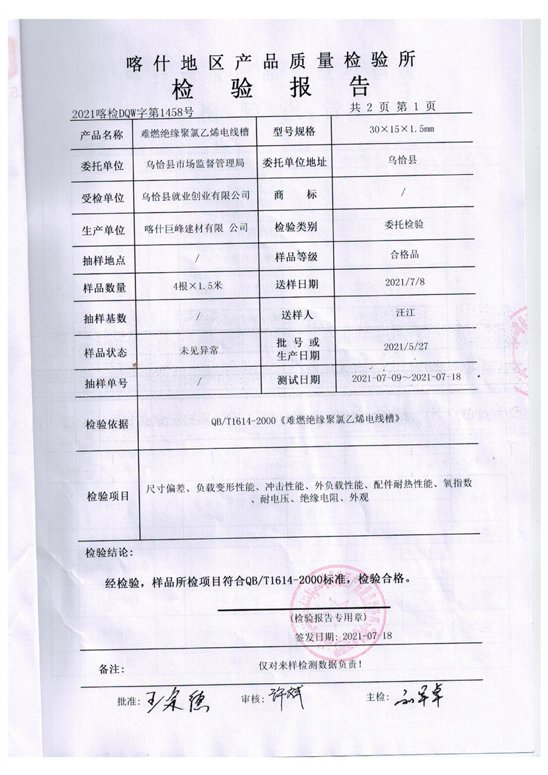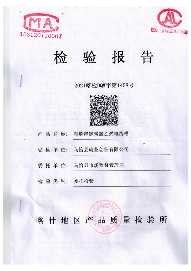 乌恰县市场监督管理局“煤改电”项目难燃绝缘聚氯乙烯电线槽检验报告