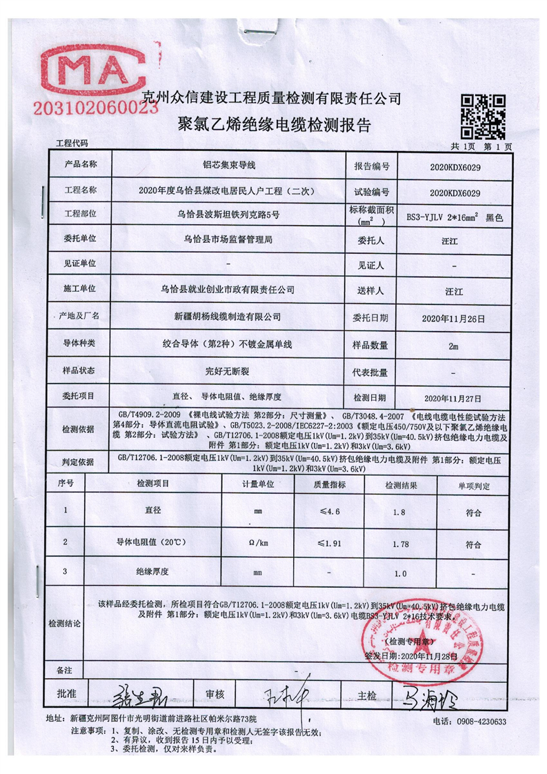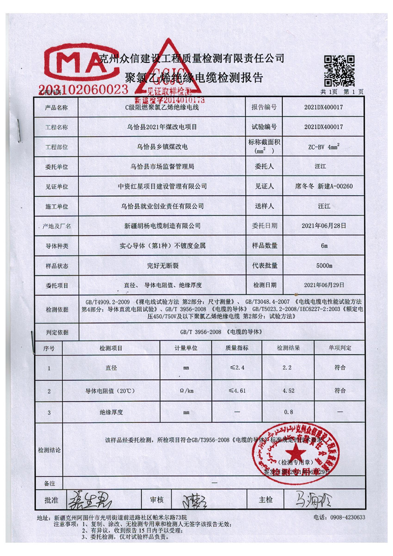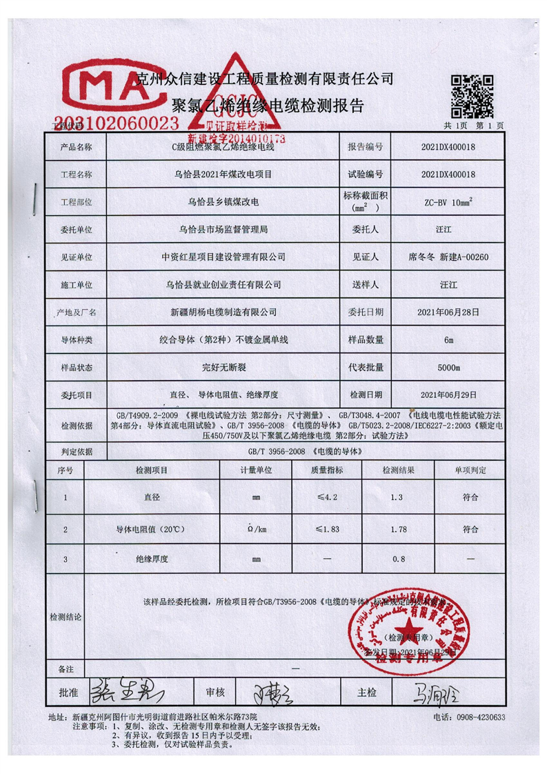 克州众信建设工程质量检测有限责任公司聚氯乙烯缘电缆检测报告