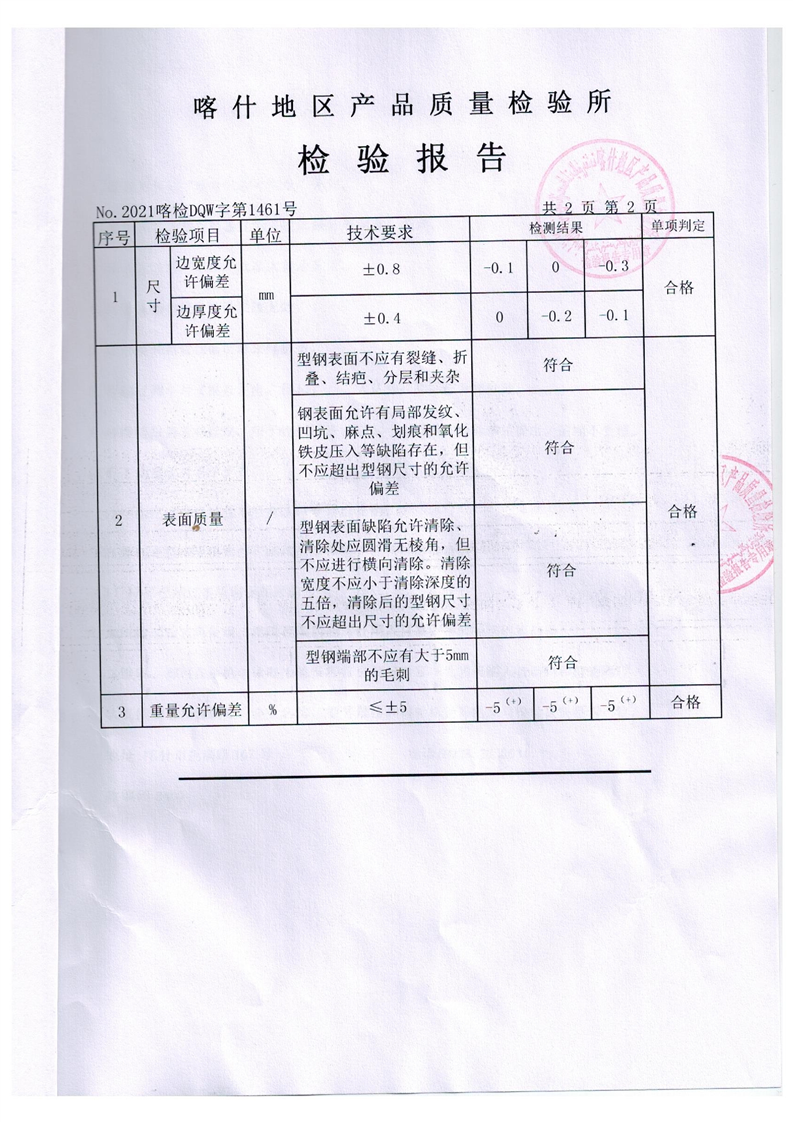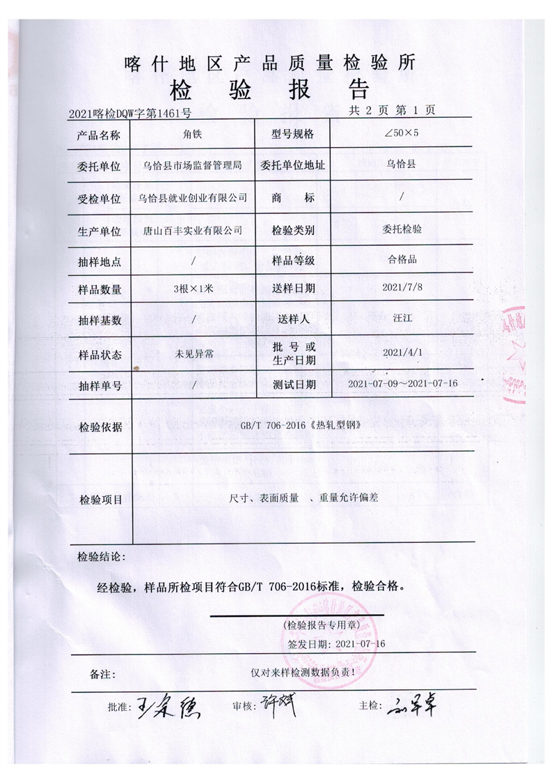 乌恰县市场监督管理局“煤改电”项目角铁检验报告