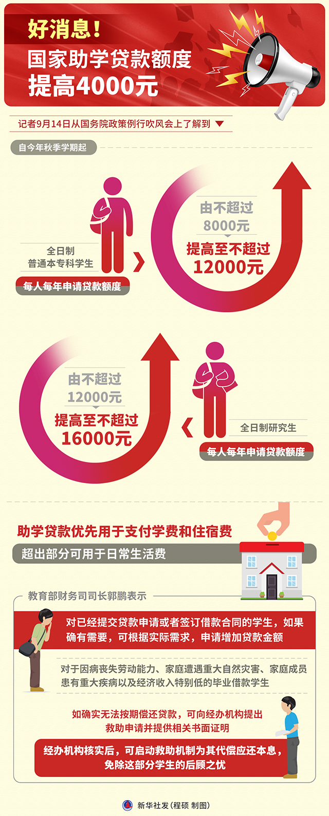 新华社发 程硕 制图记者9月14日从国务院政策例行吹风会上了解到,自今年秋季学期起,全日制普通本专科学生每人每年申请贷款额度由不超过8000元提高至不超过12000元;全日制研究生则由不超过12000元提高至不超过16000元。