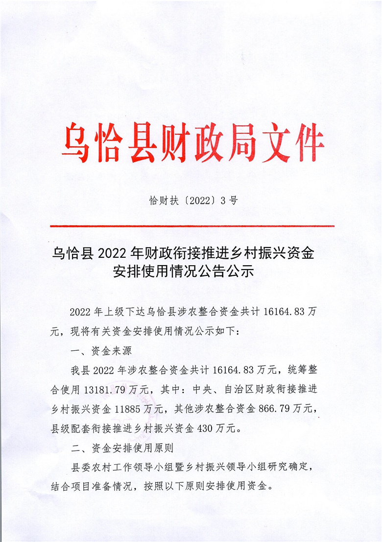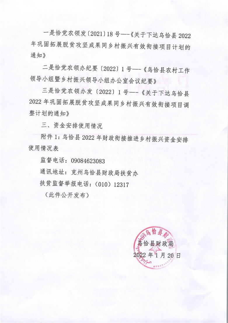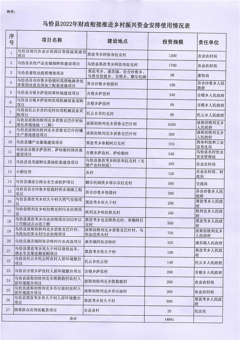 乌恰县2022年财政衔接推进乡村振兴资金安排使用情况公告公示