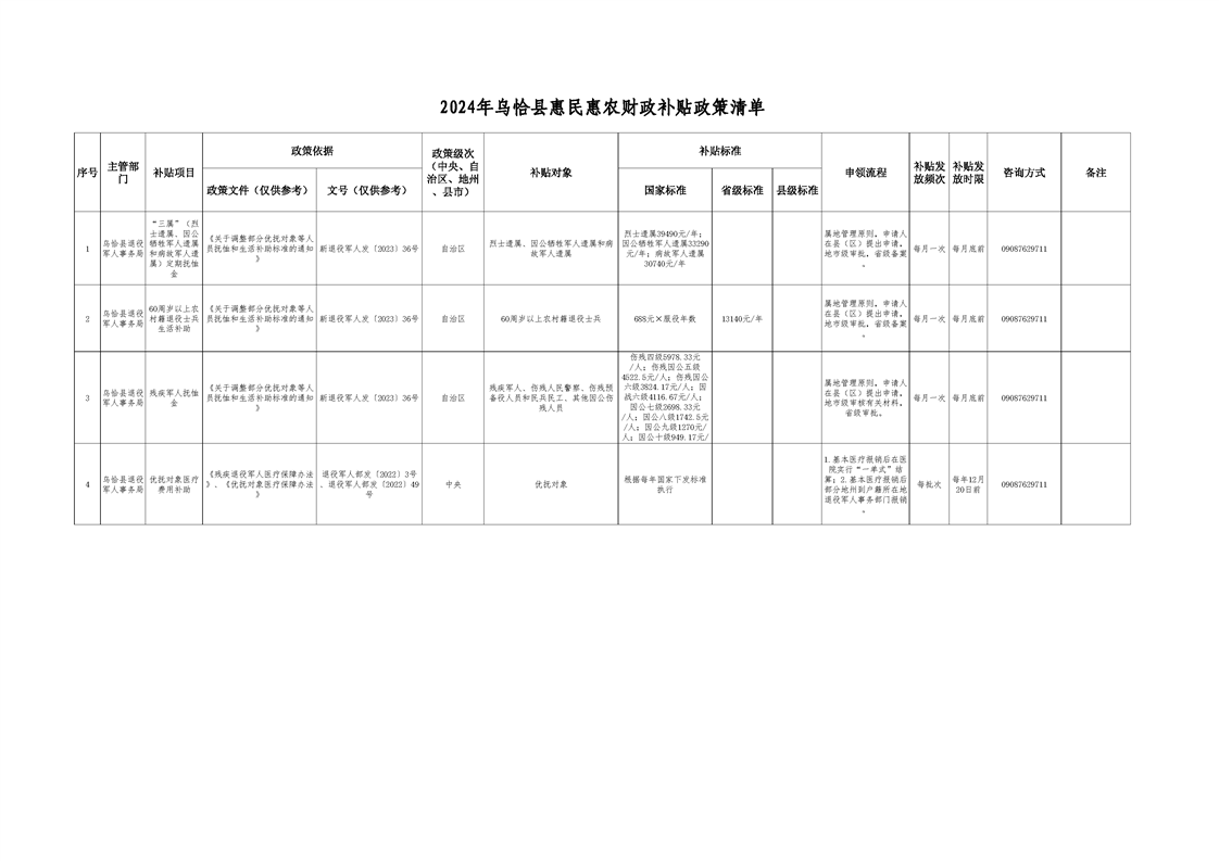 2024年乌恰县惠民惠农财政补贴政策清单