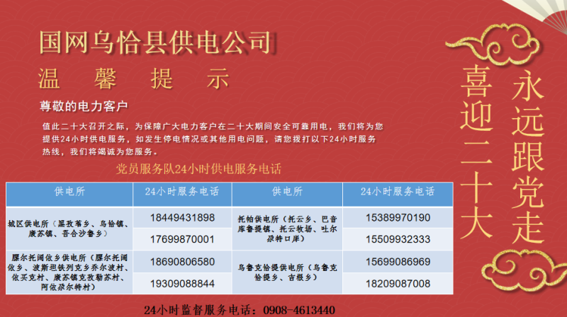 党的二十大期间国网乌恰县供电公司提供24小时供电服务电话