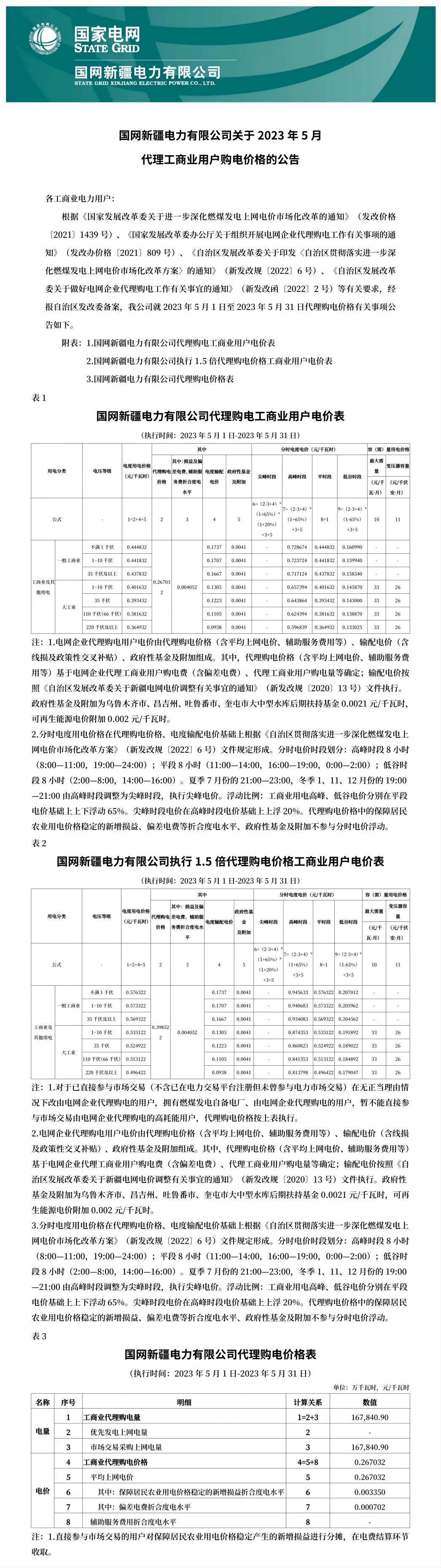 国网新疆电力有限公司关于2023年5月代理工商业用户购电价格的公告