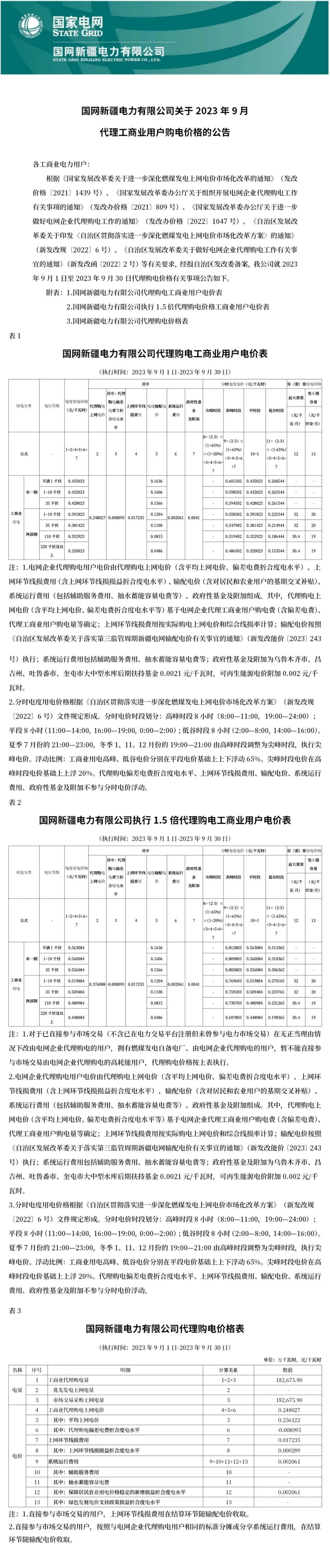 国网新疆电力有限公司关于2023年9月代理工商业用户购电价格的公告