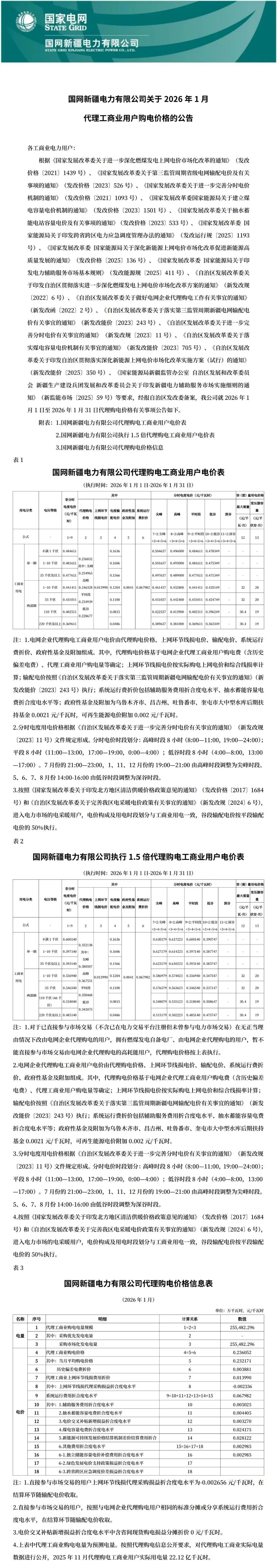 国网新疆电力有限公司关于2026年1月代理工商业用户购电价格的公告