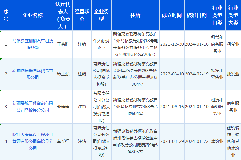 乌恰县市场监督管理局2024年第一季度企业注销名单