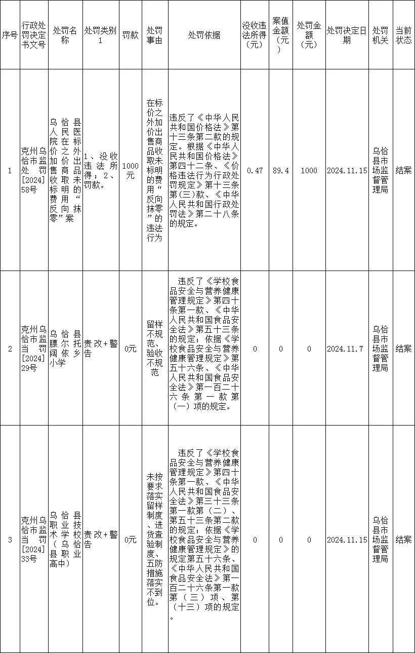 乌恰县市场监督管理局行政处罚案件(11月)