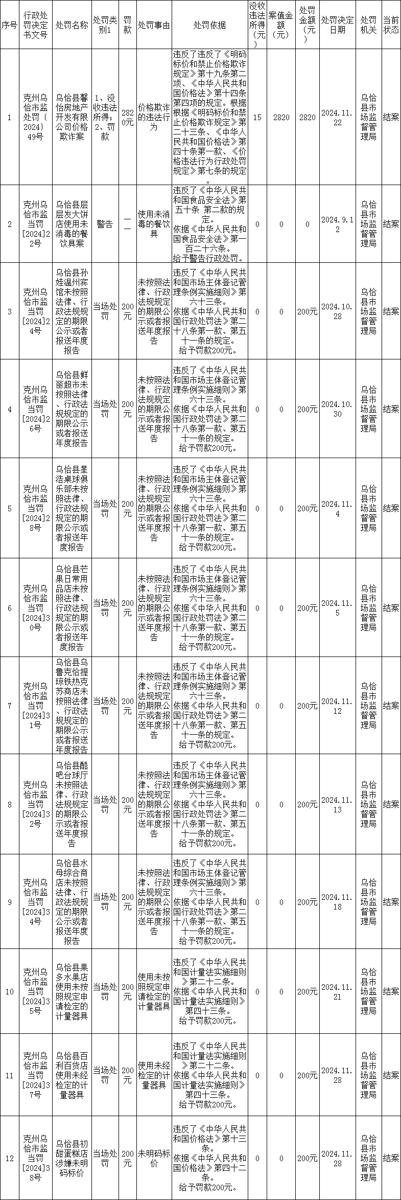 乌恰县市场监督管理局2024年行政处罚案件(12月)
