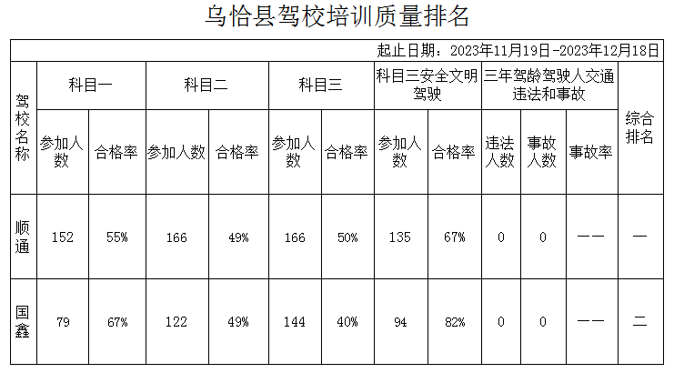 乌恰县驾培机构2023年12月份培训质量排名公示