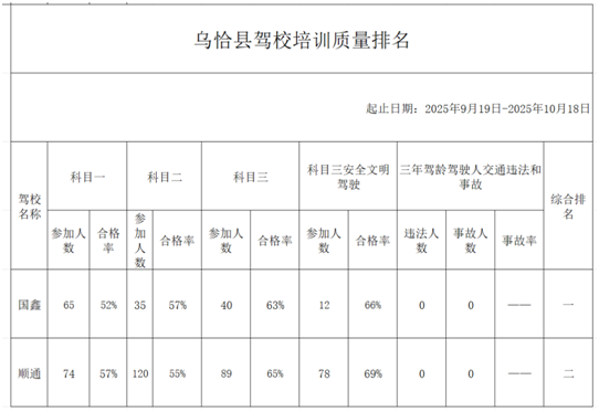 乌恰县驾培机构2025年10月份培训质量排名公示