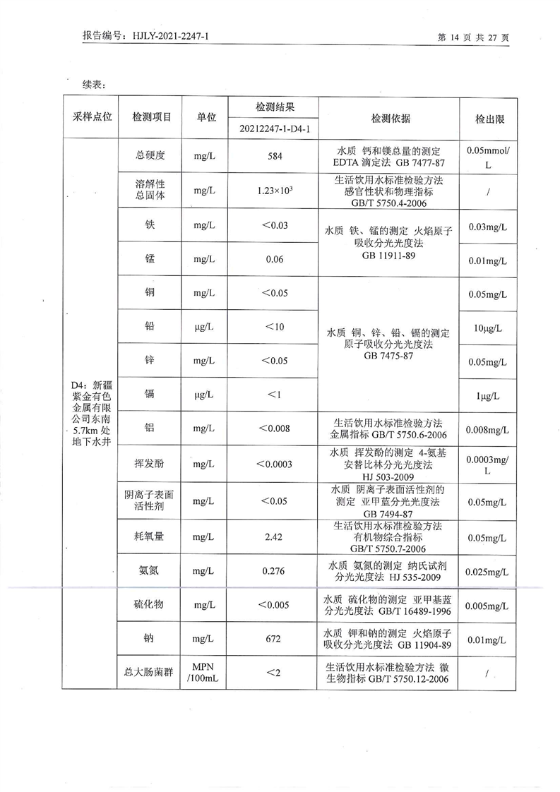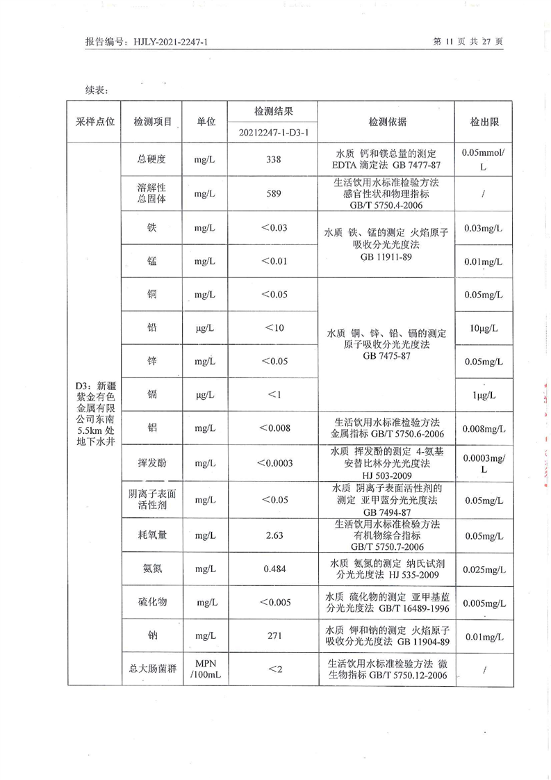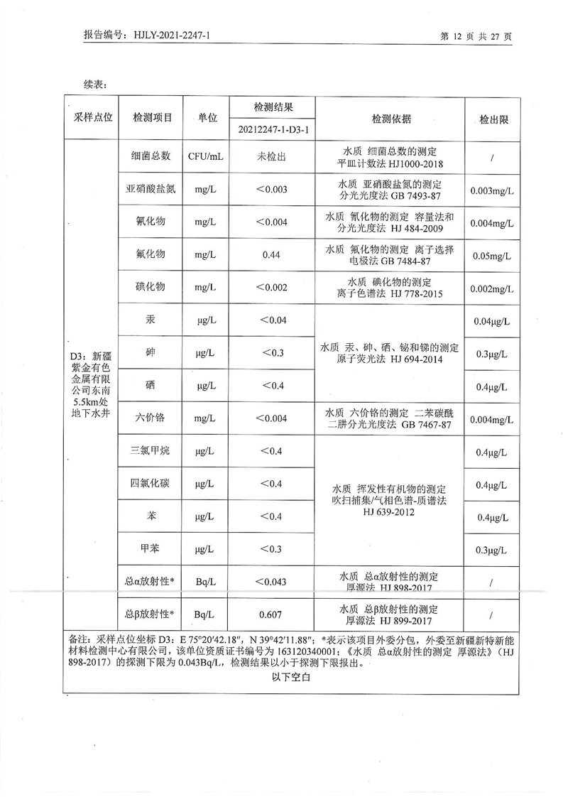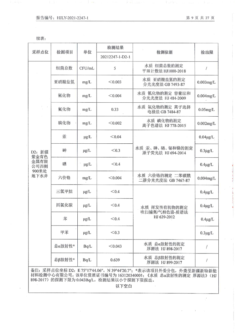 乌恰县紫金有色、汇祥永金有限公司地下水监测报告