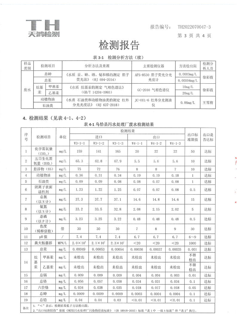 乌恰县和工业园区污水处理厂废水检测报告(第三季度)