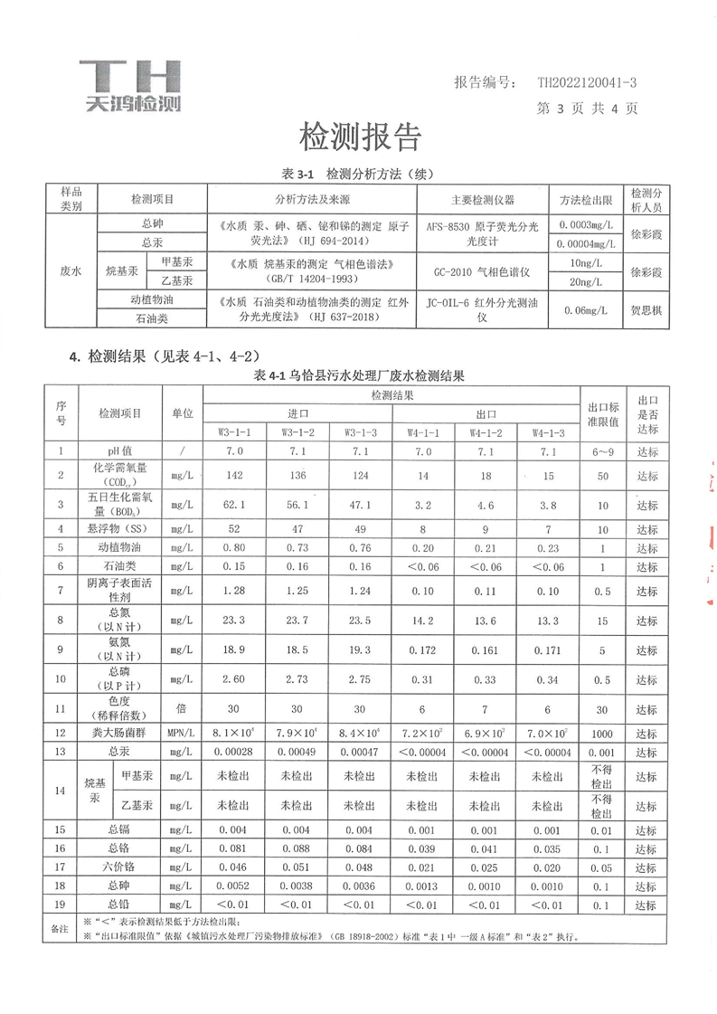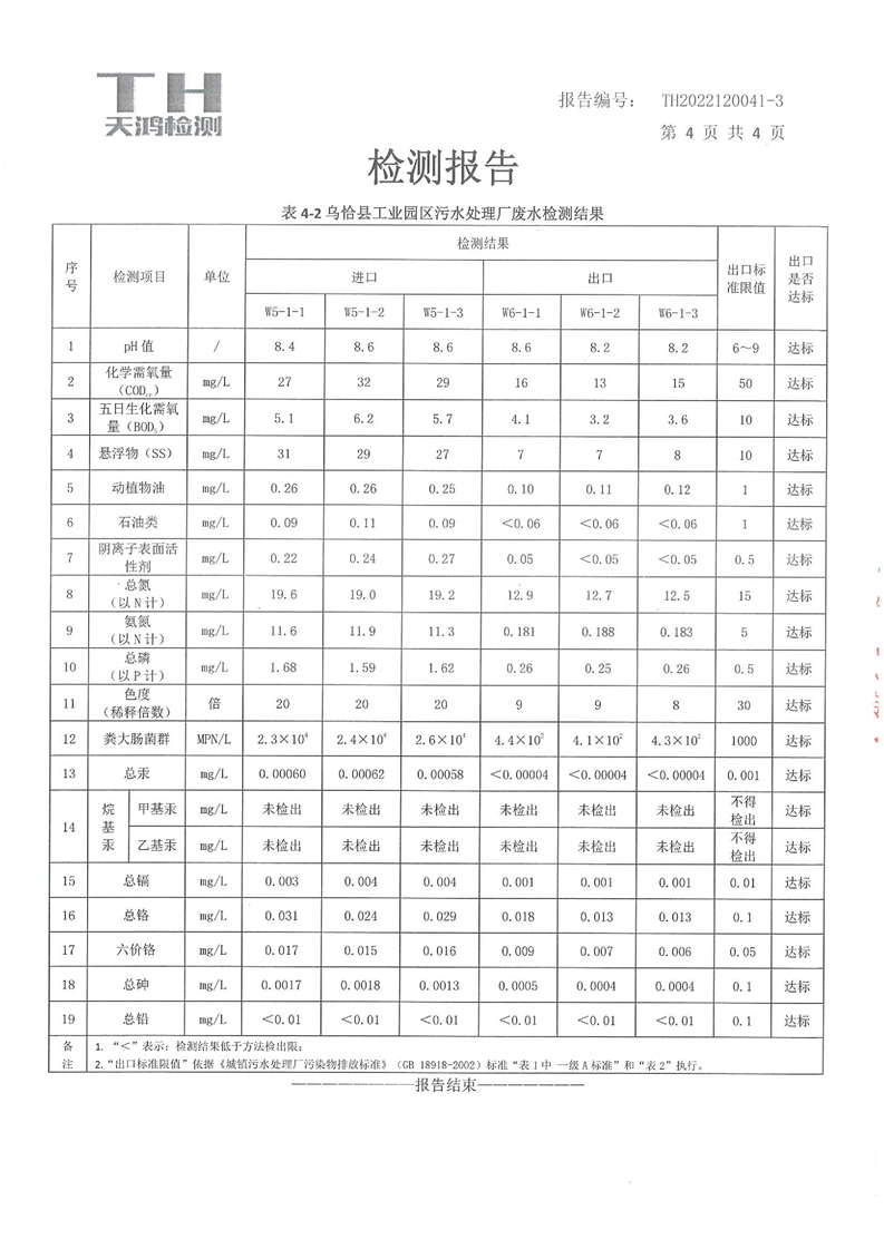 乌恰县城和工业园区污水处理厂废水检测报告(第四季度)