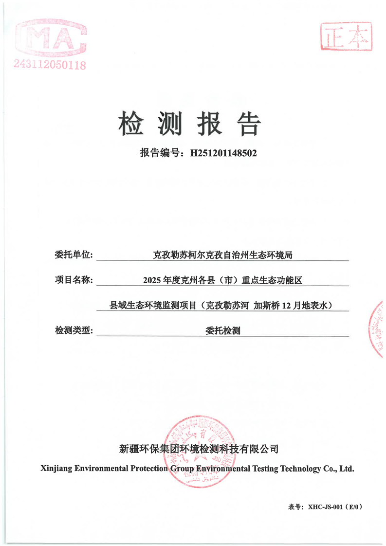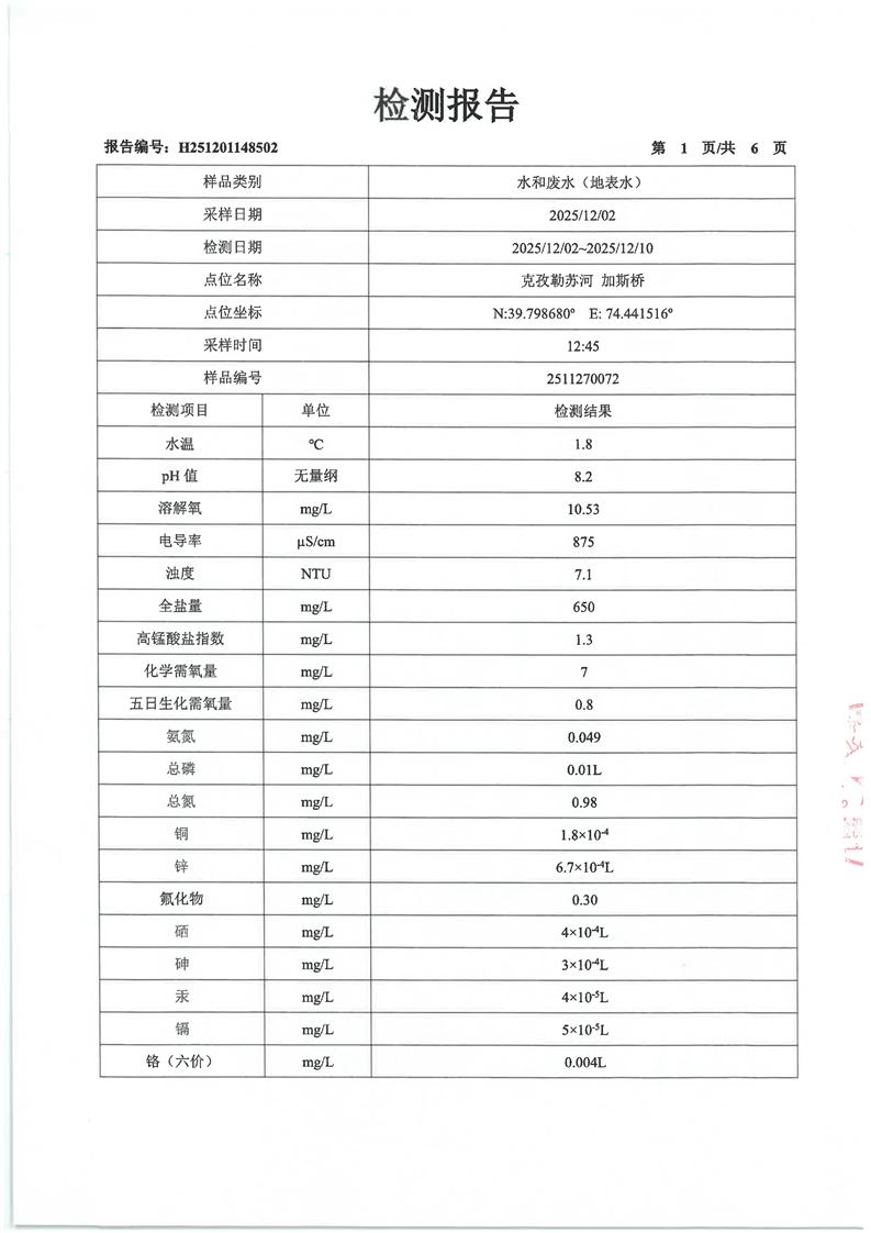克孜勒苏河加斯桥断面地表水12月检测报告