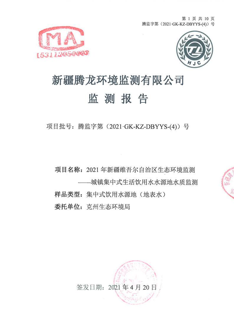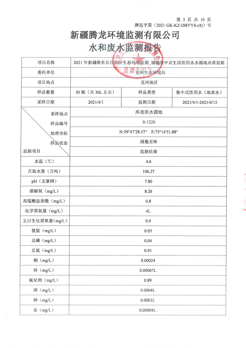 乌恰县城镇集中式生活饮用水水源地水质监测(开普太希水库第二季度)