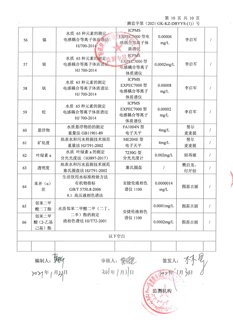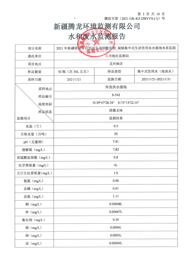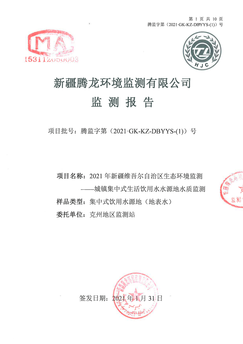 乌恰县城镇集中式生活饮用水水源地水质监测(开普太希水库第一季度)