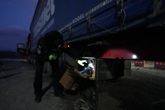 图为边检站执勤民警对即将出口的设备车进行车体检查(雷鸣辉摄)