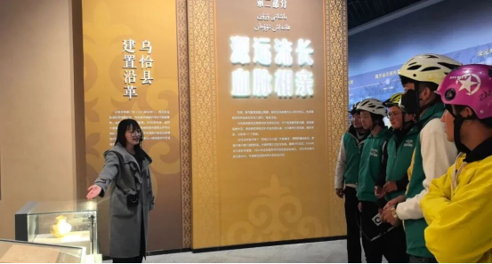 活动尾声,相关单位为外卖配送车辆装饰国旗,强化节日氛围与家国情怀,并组织代表参观乌恰县文博馆。通过了解乌恰历史变迁、民俗文化与人文风貌,大家接受了一次深刻的爱国主义和民族团结教育,进一步增强了对城市的认同感和归属感。