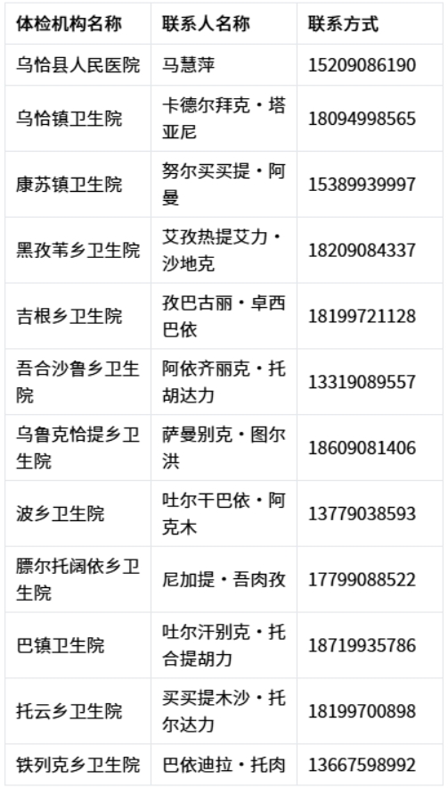 为方便群众咨询,附乌恰县全民健康体检各机构咨询电话(如下图)。