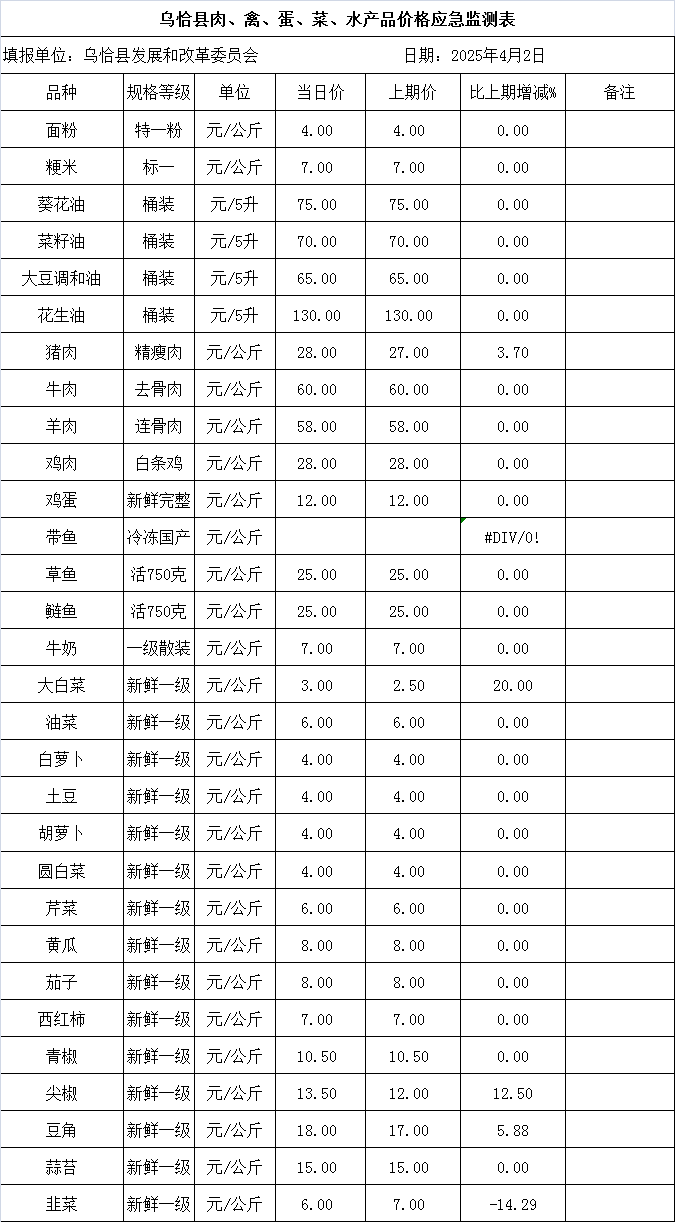 乌恰县肉、禽、蛋、菜、水产品价格应急监测表
