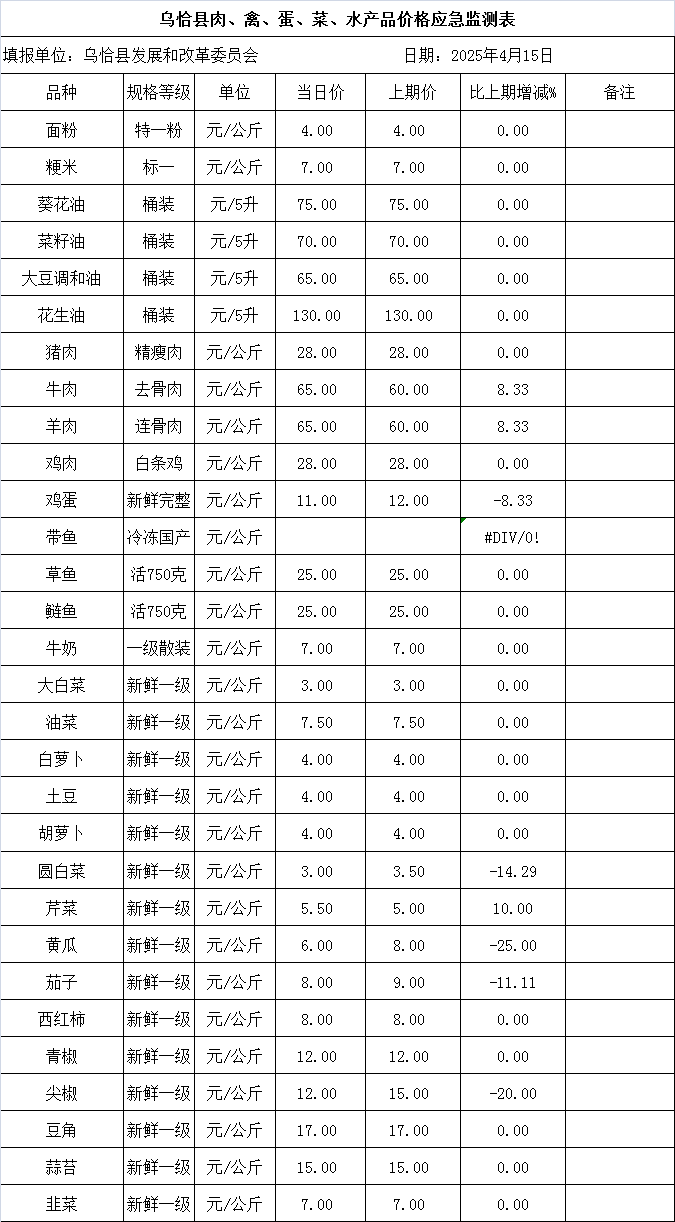 乌恰县肉、禽、蛋、菜、水产品价格应急监测表