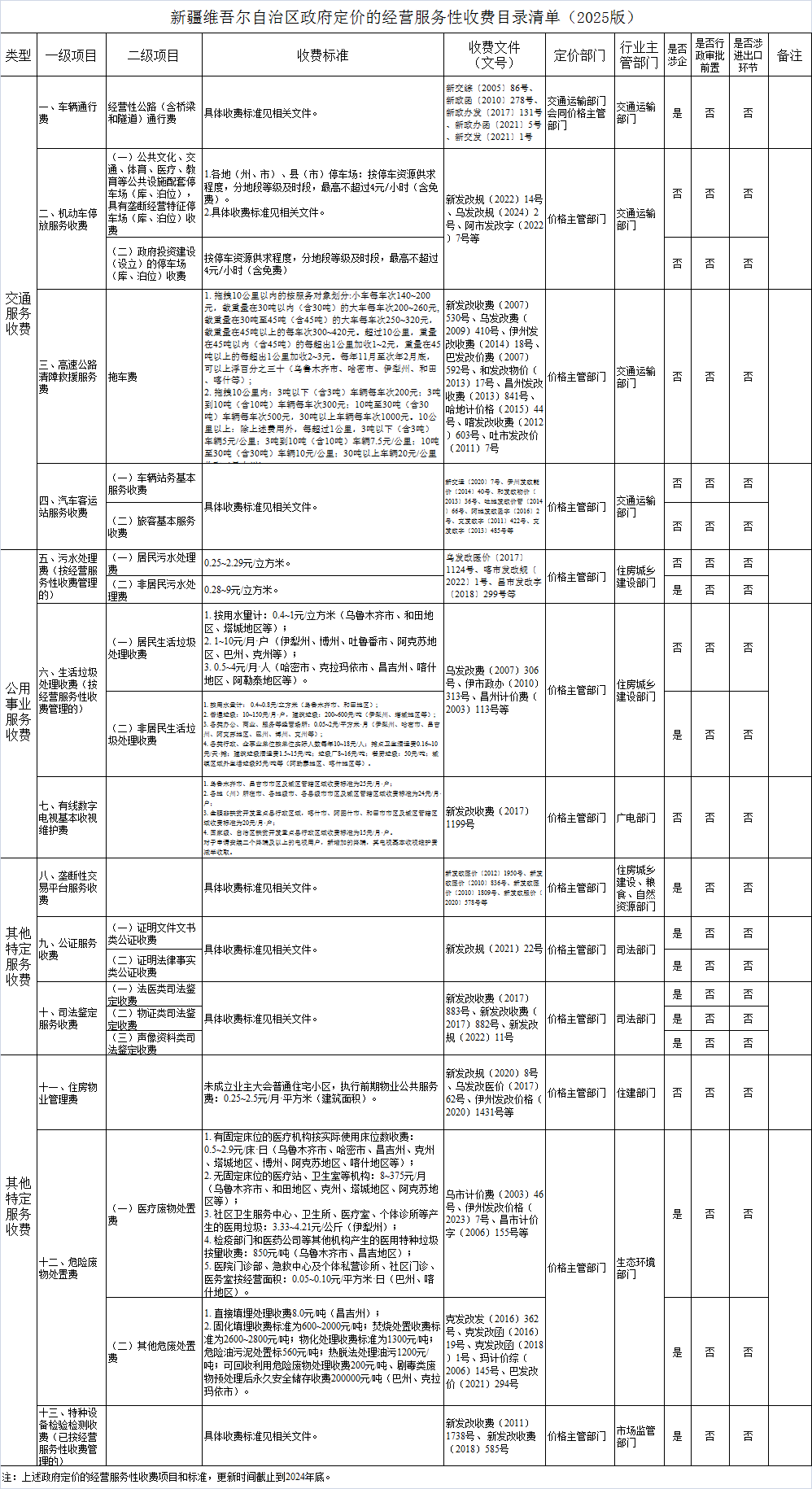 新疆维吾尔自治区政府定价的经营服务性收费目录清单(2025版)