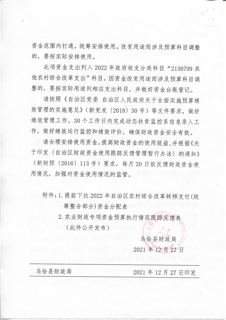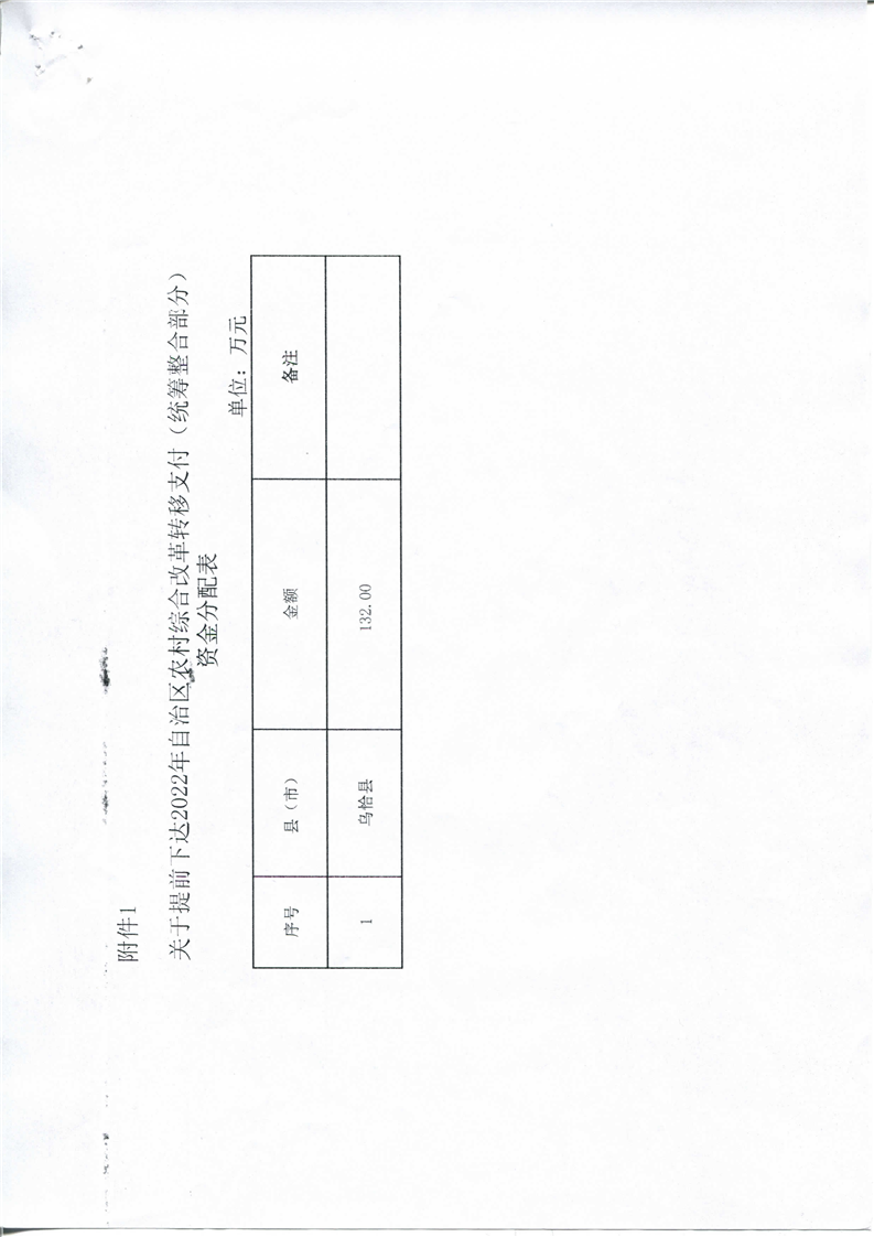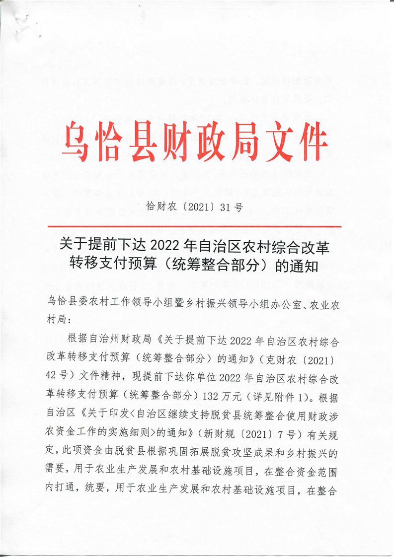 关于提前下达2022年自治区农村综合改革转移支付预算(统筹整合部分)的通知
