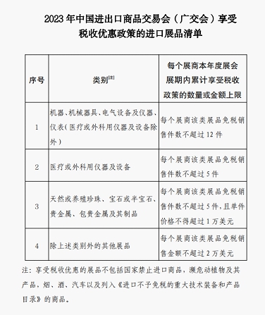 2023年中国进出口商品交易会(广交会)享受税收优惠政策的进口展品清单。图片来源:财政部官网