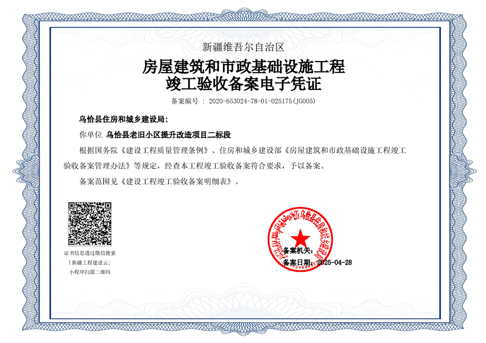 乌恰县老旧小区提升改造项目二标段竣工验收备案电子凭证