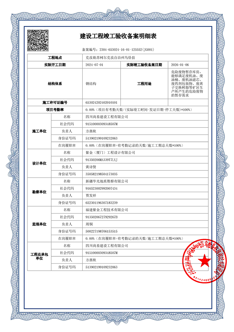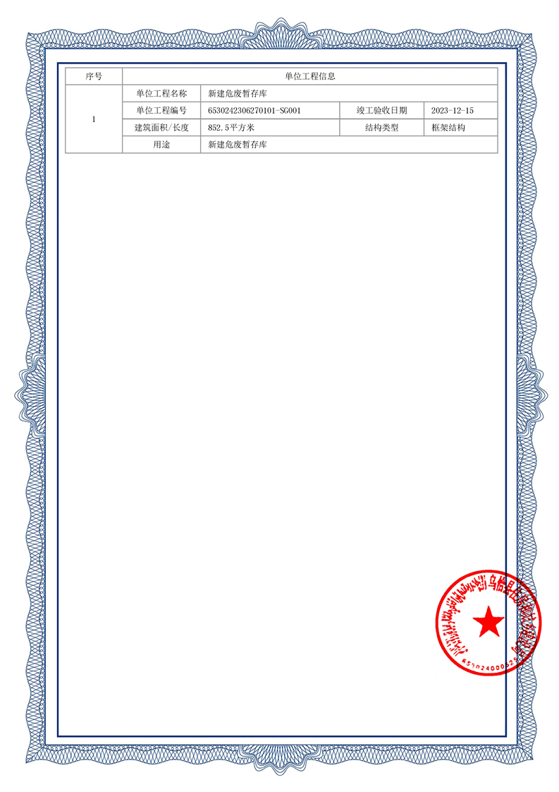 新疆紫金锌业有限公司新建危废暂存库项目竣工验收备案电子凭证