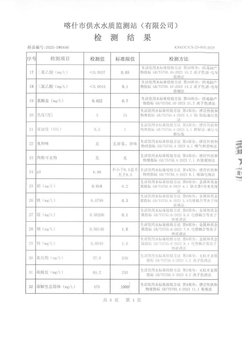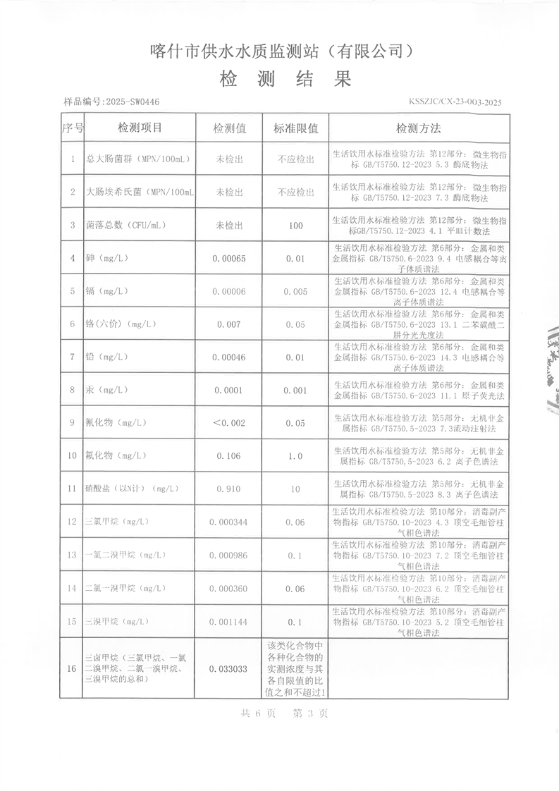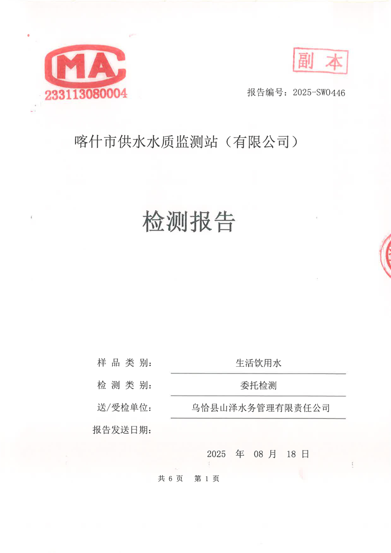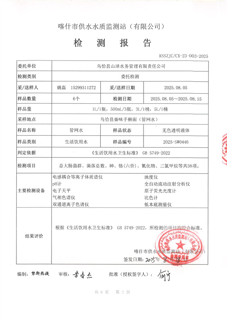 乌恰县2025年8月水质检测报告(生活饮用水)