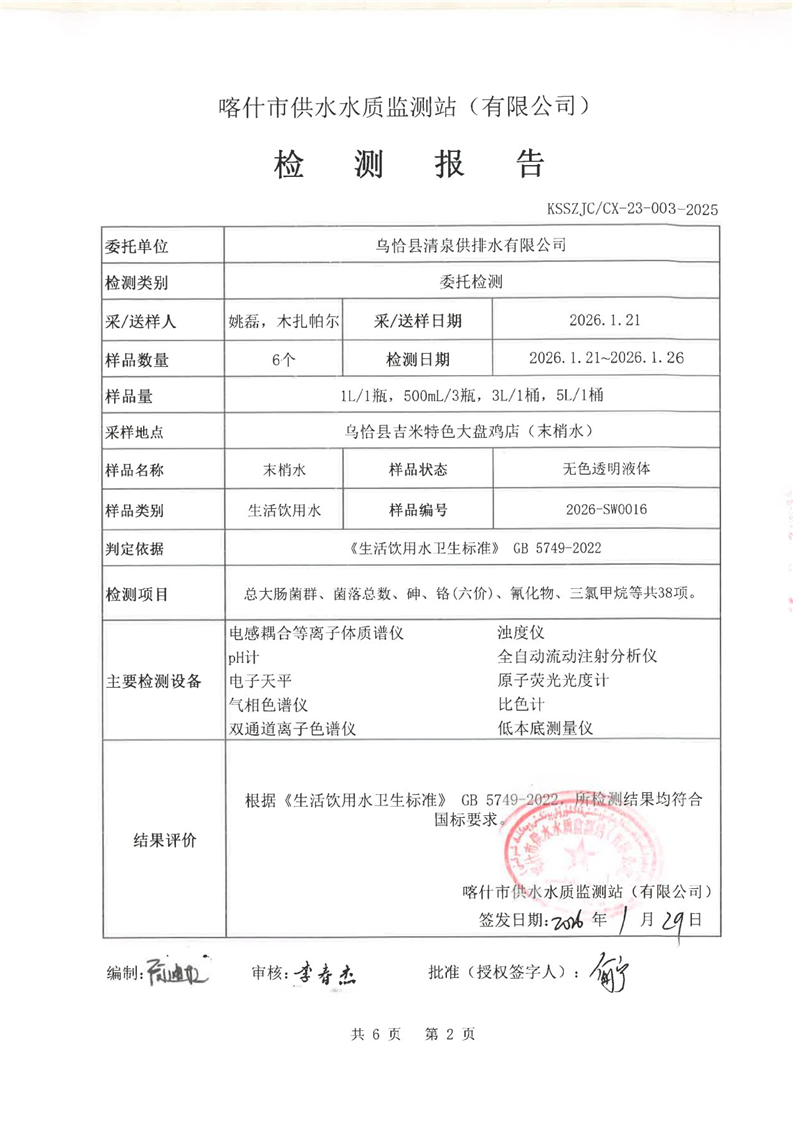乌恰县2026年1月水质检测报告