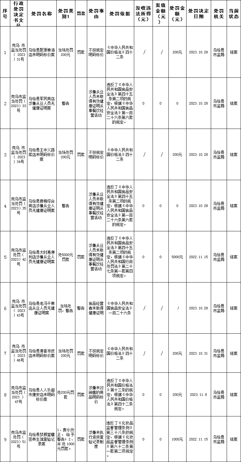 2023年乌恰县市场监督管理局行政处罚案件(11月)