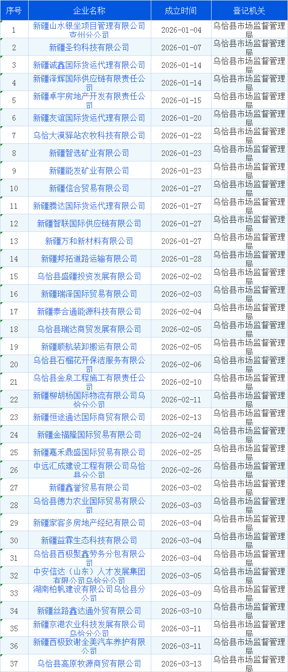 乌恰县市场监督管理局2026年第一季度新注册企业名单